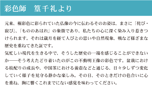 仏像の経年変化を体感できる銀の彩色彩色師・篁千礼(たかむらちひろ)氏が手掛ける限定彩色イスムの第4弾。今回は運慶像をモデルにした「イスム 不動明王」を純銀で彩ります。