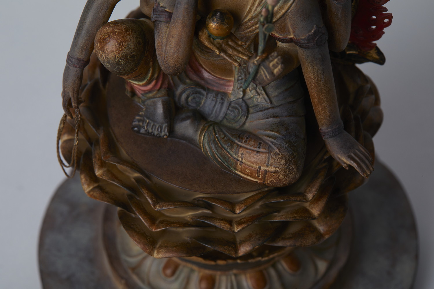 奈良時代には二臂で表されましたが、空海が密教を請来した平安時代以降は六臂の姿が主流となりました。六本の手はそれぞれ六道での救済を意味するとも言われます。