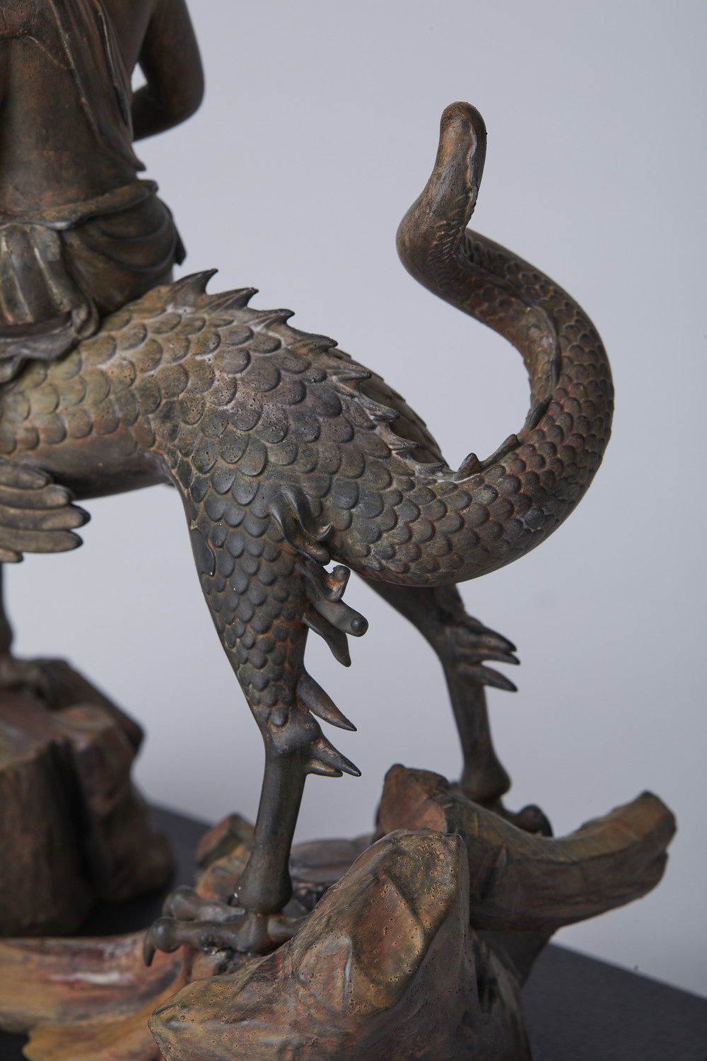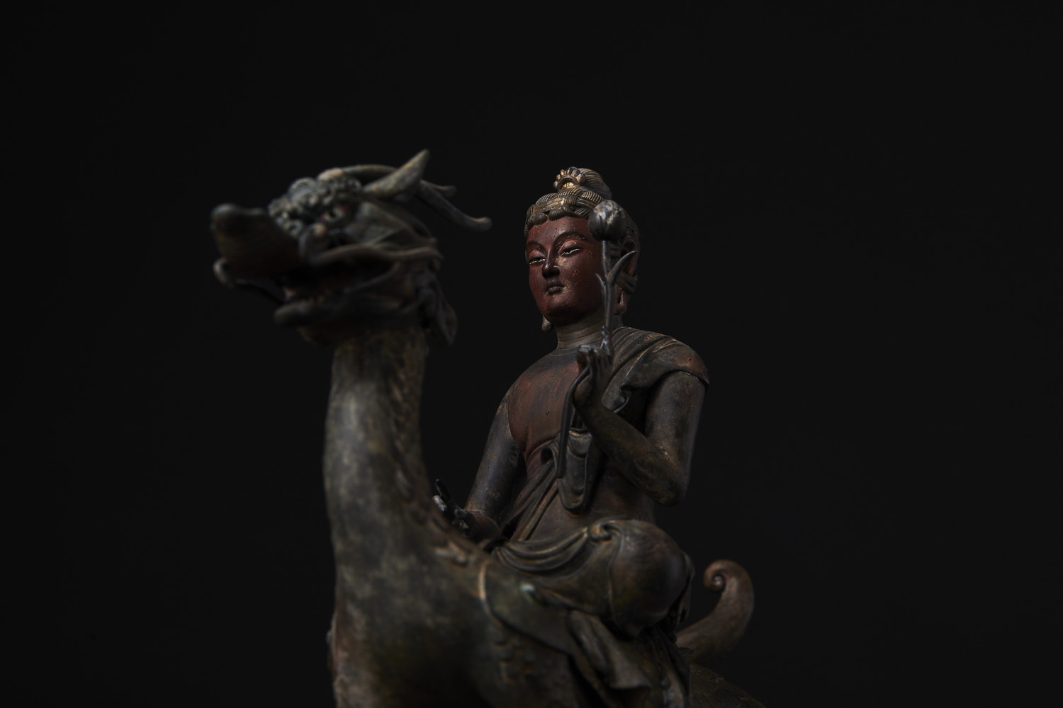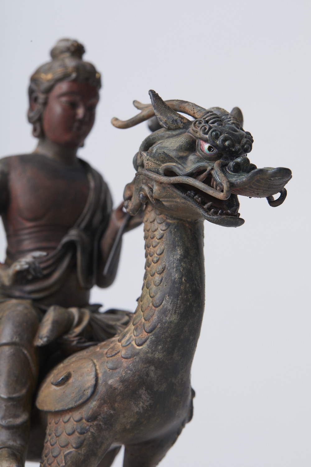 阿耨達童子は、この世のすべての事象は様ざまな役割を持って存在するが、それぞれの活動をよく見極めて正しく生きる見識を持つという妙観察智を象徴します。阿耨達池(無熱池)という清涼な場所に住み、竜王の背に坐す姿が特徴です。
